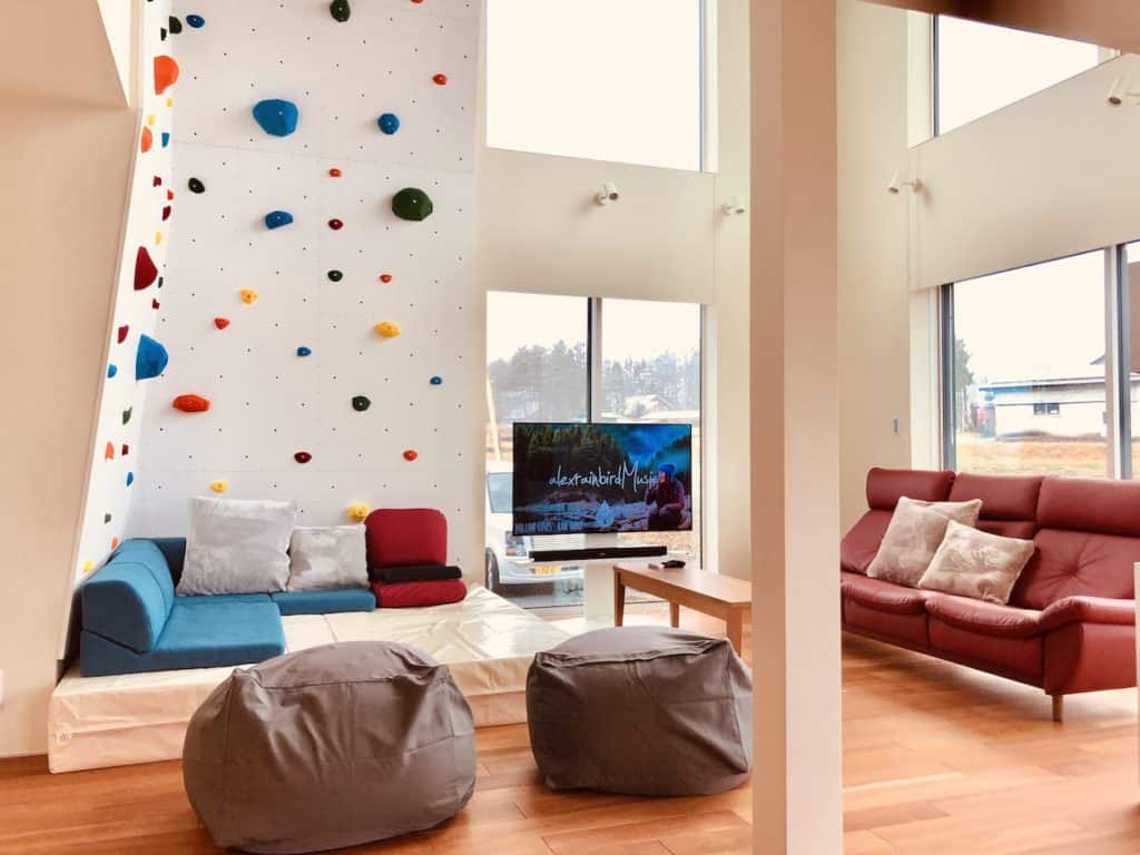 The chalet features 3 bedrooms, 2.5 bathrooms, an elevated living space, and a unique 2-story indoor rock-climbing wall. With its sleek finishes and modern Japanese design, Bikei blends style with comfort. To make your stay even better, an onsite car rental is also available to rent.