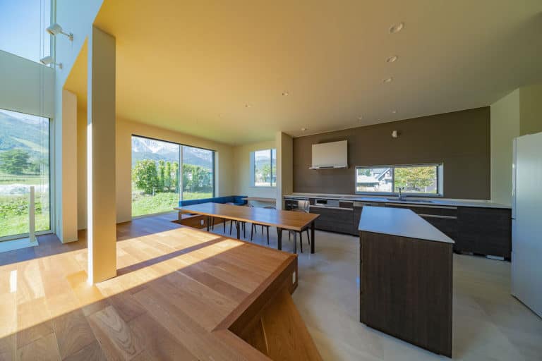Chalet Bikei is a funky modern chalet located just a 2-minute drive from Echoland, with resort shuttle stops only a 4-minute walk away. From the dining room, living room, and bedrooms, you’ll enjoy incredible mountain views.